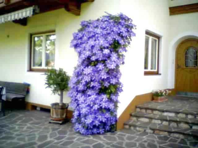 Climaties sieht schön aus. Neben der Blume steht die Bank und der Tisch. Auf der Terrasse kann man beim Frühstücken.